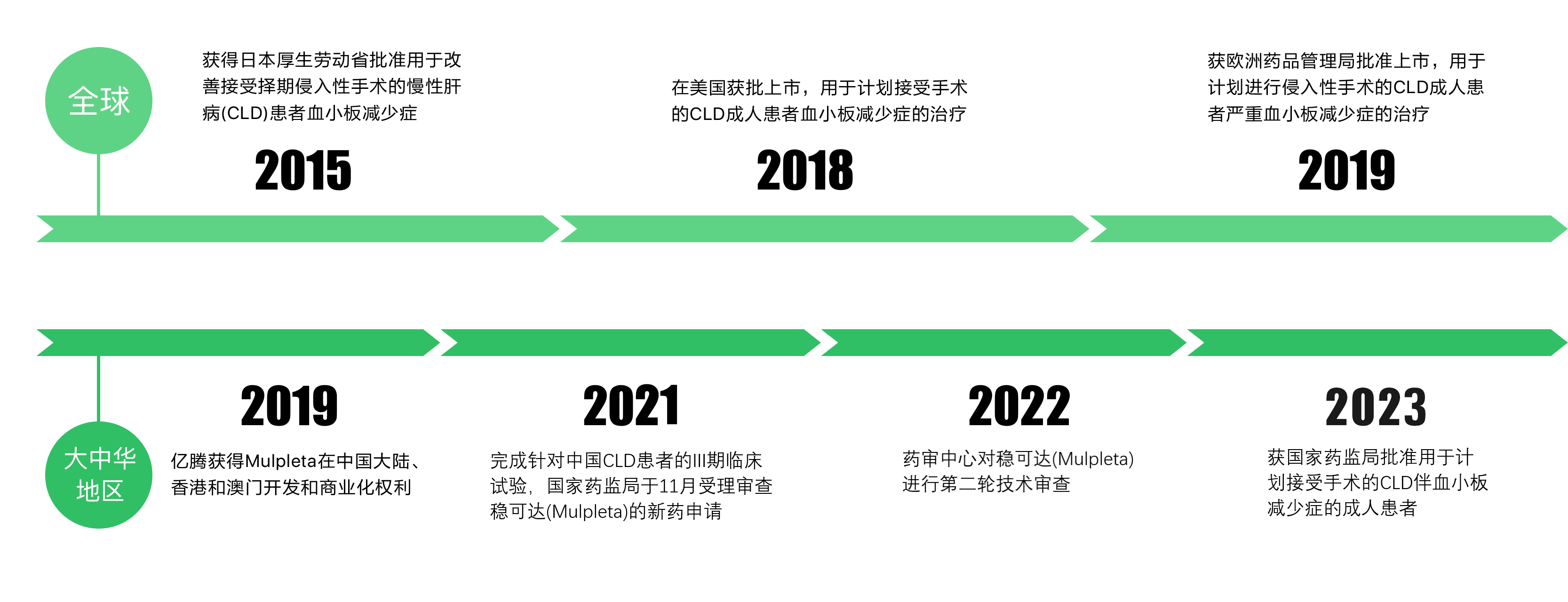 稳可达®(芦曲泊帕,日本品牌名Mulpleta®)是一种创新的第二代血小板生成素受体激动剂(TPO-RA),已获得日本、美国和欧盟的批准,用于治疗治疗计划接受侵入性治疗的慢性肝病(CLD)患者的血小板减少症 (TCP)。稳可达®已于2021年完成针对中国CLD患者的Ⅲ期临床试验,并于2023年6月获得国家药品监督管理局(NMPA)批准,适应症为适用于计划接受手术(含诊断性操作)的慢性肝病伴血小板减少症的成人患者。我们同时计划探索扩展稳可达®的适应症至CIT(肿瘤化疗所致血小板减少症)。